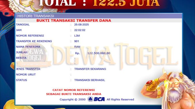 DEWATOGEL mengucapkan selamat kepada user id : RIS*** yang telah berhasil mendapatkan jackpot pada permainan SLOT DI STARLIGHT PRINCESS. Kemenangan sebesar Rp 122.500.000,-. telah dibayarkan LUNAS oleh pihak dewatogel kepada pemilik user id setelah yang bersangkutan mengisi formulir withdraw. Proses pencairan dana berlangsung sangat cepat hanya dalam waktu 5-10 menit sudah berada dalam rekening pemilik user id. Bukti transfer yang dapat anda lihat adalah bukti SAH / VALID yang langsung di dapatkan melalui bukti transaksi dari Bank yang digunakan untuk pengiriman dana pada rekening pemilik user id. Terima kasih kami sampaikan kepada para pengguna setia DEWATOGEL yang telah menggunakan situs kami, sebagai Bandar Terpercaya yang pastinya membayar semua kemenangan member hingga lunas. Apakah DEWATOGEL PENIPU ? Reputasi “DEWATOGEL TERPERCAYA” sudah sangat melekat. puluhan hingga ratusan ribu pengguna setia DEWATOGEL tetap menggunakan situs terbesar dan terbaik di Indonesia ini. Hapus rasa was-was dan khawatir anda, kemenangan anda berapapun PASTI dibayarkan hingga lunas.