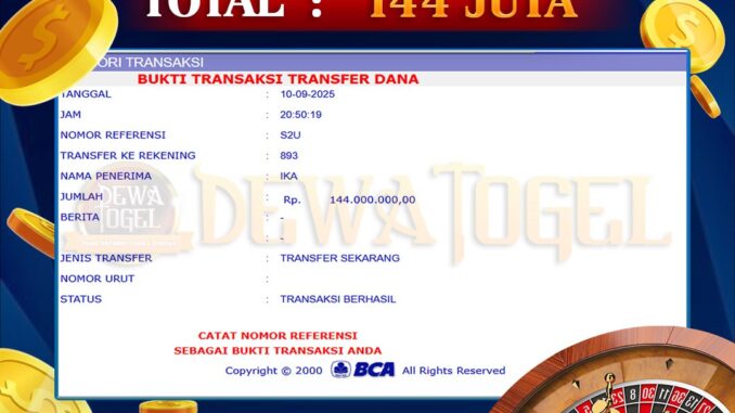 DEWATOGEL mengucapkan selamat kepada user id : SUR*** yang telah berhasil mendapatkan jackpot pada permainan LIVE CASINO DI BINGO SICBO. Kemenangan sebesar Rp 144.000.000,-. telah dibayarkan LUNAS oleh pihak dewatogel kepada pemilik user id setelah yang bersangkutan mengisi formulir withdraw. Proses pencairan dana berlangsung sangat cepat hanya dalam waktu 5-10 menit sudah berada dalam rekening pemilik user id. Bukti transfer yang dapat anda lihat adalah bukti SAH / VALID yang langsung di dapatkan melalui bukti transaksi dari Bank yang digunakan untuk pengiriman dana pada rekening pemilik user id. Terima kasih kami sampaikan kepada para pengguna setia DEWATOGEL yang telah menggunakan situs kami, sebagai Bandar Terpercaya yang pastinya membayar semua kemenangan member hingga lunas. Apakah DEWATOGEL PENIPU ? Reputasi “DEWATOGEL TERPERCAYA” sudah sangat melekat. puluhan hingga ratusan ribu pengguna setia DEWATOGEL tetap menggunakan situs terbesar dan terbaik di Indonesia ini. Hapus rasa was-was dan khawatir anda, kemenangan anda berapapun PASTI dibayarkan hingga lunas.