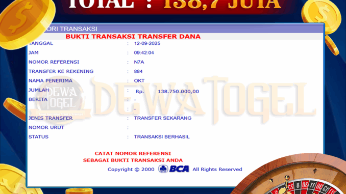 DEWATOGEL mengucapkan selamat kepada user id : ADI*** yang telah berhasil mendapatkan jackpot pada permainan LIVE CASINO DI ROULETTE. Kemenangan sebesar Rp 138.750.000,-. telah dibayarkan LUNAS oleh pihak dewatogel kepada pemilik user id setelah yang bersangkutan mengisi formulir withdraw. Proses pencairan dana berlangsung sangat cepat hanya dalam waktu 5-10 menit sudah berada dalam rekening pemilik user id. Bukti transfer yang dapat anda lihat adalah bukti SAH / VALID yang langsung di dapatkan melalui bukti transaksi dari Bank yang digunakan untuk pengiriman dana pada rekening pemilik user id. Terima kasih kami sampaikan kepada para pengguna setia DEWATOGEL yang telah menggunakan situs kami, sebagai Bandar Terpercaya yang pastinya membayar semua kemenangan member hingga lunas. Apakah DEWATOGEL PENIPU ? Reputasi “DEWATOGEL TERPERCAYA” sudah sangat melekat. puluhan hingga ratusan ribu pengguna setia DEWATOGEL tetap menggunakan situs terbesar dan terbaik di Indonesia ini. Hapus rasa was-was dan khawatir anda, kemenangan anda berapapun PASTI dibayarkan hingga lunas.