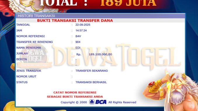 DEWATOGEL mengucapkan selamat kepada user id : ROL*** yang telah berhasil mendapatkan jackpot pada permainan SLOT DI GATES OF OLYMPUS 1000. Kemenangan sebesar Rp 189.000.000,-. telah dibayarkan LUNAS oleh pihak dewatogel kepada pemilik user id setelah yang bersangkutan mengisi formulir withdraw. Proses pencairan dana berlangsung sangat cepat hanya dalam waktu 5-10 menit sudah berada dalam rekening pemilik user id. Bukti transfer yang dapat anda lihat adalah bukti SAH / VALID yang langsung di dapatkan melalui bukti transaksi dari Bank yang digunakan untuk pengiriman dana pada rekening pemilik user id. Terima kasih kami sampaikan kepada para pengguna setia DEWATOGEL yang telah menggunakan situs kami, sebagai Bandar Terpercaya yang pastinya membayar semua kemenangan member hingga lunas. Apakah DEWATOGEL PENIPU ? Reputasi “DEWATOGEL TERPERCAYA” sudah sangat melekat. puluhan hingga ratusan ribu pengguna setia DEWATOGEL tetap menggunakan situs terbesar dan terbaik di Indonesia ini. Hapus rasa was-was dan khawatir anda, kemenangan anda berapapun PASTI dibayarkan hingga lunas.