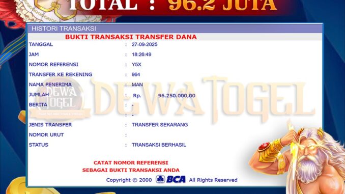 DEWATOGEL mengucapkan selamat kepada user id : MAN*** yang telah berhasil mendapatkan jackpot pada permainan SLOT DI GATES OF OLYMPUS 1000. Kemenangan sebesar Rp 96.200.000,-. telah dibayarkan LUNAS oleh pihak dewatogel kepada pemilik user id setelah yang bersangkutan mengisi formulir withdraw. Proses pencairan dana berlangsung sangat cepat hanya dalam waktu 5-10 menit sudah berada dalam rekening pemilik user id. Bukti transfer yang dapat anda lihat adalah bukti SAH / VALID yang langsung di dapatkan melalui bukti transaksi dari Bank yang digunakan untuk pengiriman dana pada rekening pemilik user id. Terima kasih kami sampaikan kepada para pengguna setia DEWATOGEL yang telah menggunakan situs kami, sebagai Bandar Terpercaya yang pastinya membayar semua kemenangan member hingga lunas. Apakah DEWATOGEL PENIPU ? Reputasi “DEWATOGEL TERPERCAYA” sudah sangat melekat. puluhan hingga ratusan ribu pengguna setia DEWATOGEL tetap menggunakan situs terbesar dan terbaik di Indonesia ini. Hapus rasa was-was dan khawatir anda, kemenangan anda berapapun PASTI dibayarkan hingga lunas.