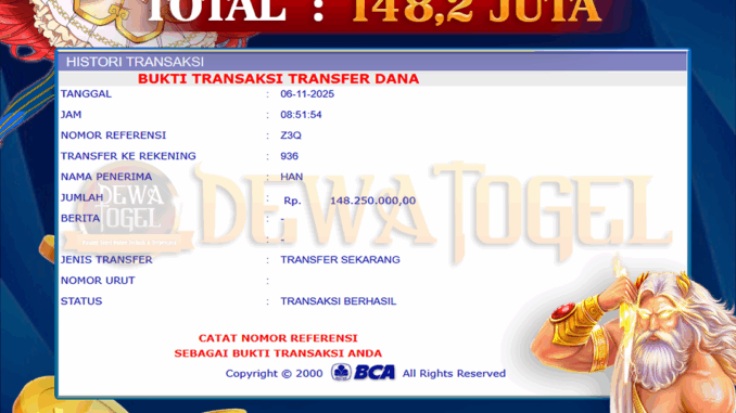 DEWATOGEL mengucapkan selamat kepada user id : ULA*** yang telah berhasil mendapatkan jackpot pada permainan SLOT AZTEC GEMS. Kemenangan sebesar Rp 148.200.000,- telah dibayarkan LUNAS oleh pihak dewatogel kepada pemilik user id setelah yang bersangkutan mengisi formulir withdraw. Proses pencairan dana berlangsung sangat cepat hanya dalam waktu 5-10 menit sudah berada dalam rekening pemilik user id. Bukti transfer yang dapat anda lihat adalah bukti SAH / VALID yang langsung di dapatkan melalui bukti transaksi dari Bank yang digunakan untuk pengiriman dana pada rekening pemilik user id. Terima kasih kami sampaikan kepada para pengguna setia DEWATOGEL yang telah menggunakan situs kami, sebagai Bandar Terpercaya yang pastinya membayar semua kemenangan member hingga lunas. Apakah DEWATOGEL PENIPU ? Reputasi “DEWATOGEL TERPERCAYA” sudah sangat melekat. puluhan hingga ratusan ribu pengguna setia DEWATOGEL tetap menggunakan situs terbesar dan terbaik di Indonesia ini. Hapus rasa was-was dan khawatir anda, kemenangan anda berapapun PASTI dibayarkan hingga lunas.